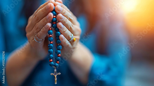 Hands Clasped in Prayer Holding a Blue Rosary With a Cross Against a Glowing Background at Sunset