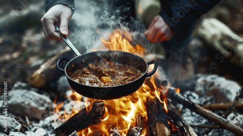 Hands cooking a hearty stew in a cast iron pan over an open campfire in the woods
