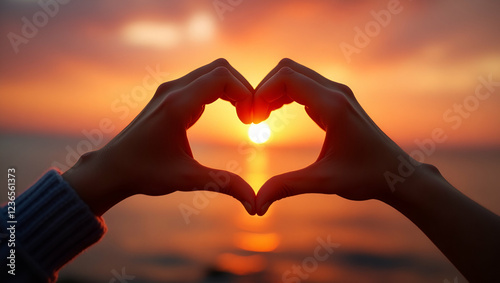 Hands Forming Heart Shape Against Beautiful Sunset Over Water