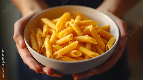 pasta, penne, bowl, hand, holding, cooked, food, italian, cookery, dish, meal, dinner, lunch, carbohydrate, wheat, gluten, durum, semolina, yellow, orange, white, ceramic, finger, nail, skin, closeup, macro, delicious, tasty, savoury, healthy, nourishment, comfort, classic, simple, traditional, homemade, eatery, family, kitchen, dining, eat, appetence, gastronomy, culinary