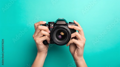 camera, photo, hand, holding, vintage, retro, equipment, device, technology, photographer, shooting, capture, image, lens, shutter, viewfinder, film, analog, nostalgia, hobby, creative, art, background, teal, turquoise, blue, green, overhead, top