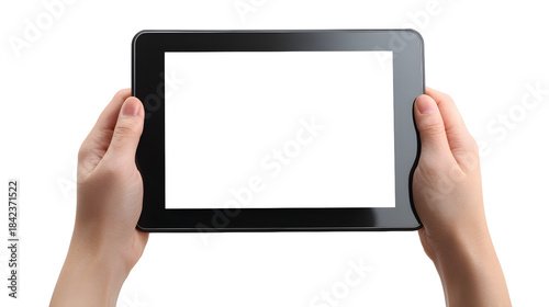 Hands holding blank screen tablet on white background