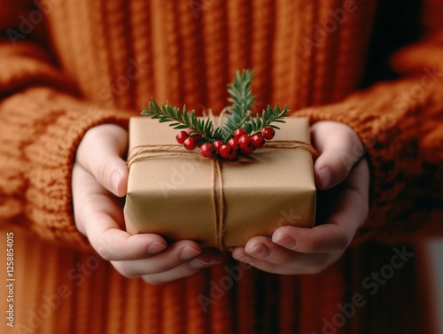 gift, hand, present, holiday, christmas, sweater, holding, brown paper, wrapping, package, giving, warm, cosy, celebration, winter, seasonal, festive, decoration, tied, string, berry, greenery, neutral, craft, minimalist, rustic