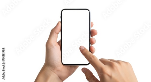 Hands Holding Modern Smartphone with Blank White Screen and Touching Display. Isolated on White Background.