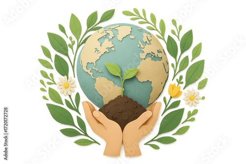 Hands holding soil with a small plant, surrounded by a globe and green leaves illustration