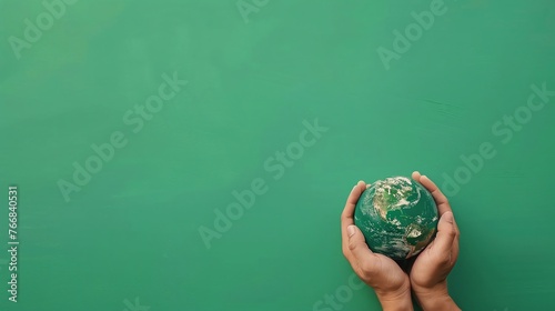 hands holding the earth positioned in the bottom-right corner with ample space for text on a bright green background, promoting environmental themes
