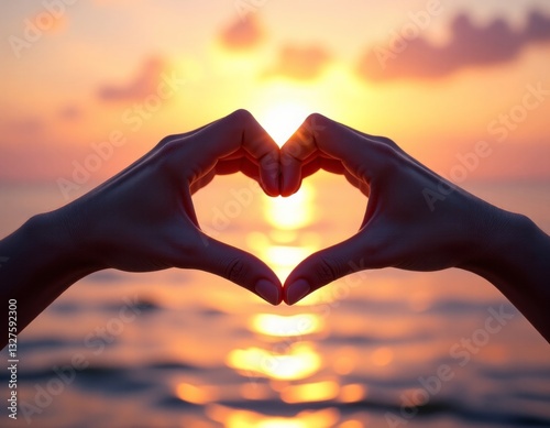 Hands intertwining heart shape, photorealistic, golden hour sunset, 8K, love, affection, vaporwave aesthetics, copy space