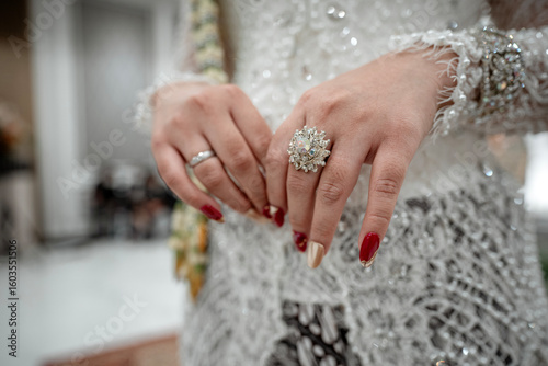 Hands of an Indonesian bride wearing a traditional lace kebaya, showing a large ornate ring, wedding band, and manicure. Javanese wedding detail.