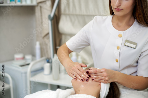 Hands of beautician making facial lifting massage for pretty young woman in SPA salon
