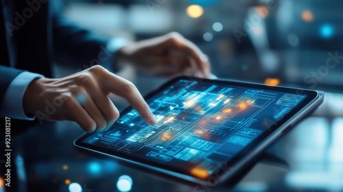 hand, of, businessman, holding, touching, tablet, on, table, working, with, high technology, business, datum, interface, at, office, computer, hand, technology, laptop, keyboard, cyberspace, woman, work, typing, communication, finger, screen, service, buttons, people, display, mouse, equipment, success