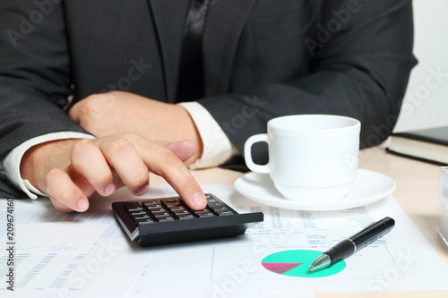 Hands of calculating businessman sitting at table with cup, documents, diagrams