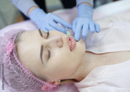 Hands of cosmetologist making injection in face, lips. Young woman gets beauty facial injections in salon. Face aging, rejuvenation and hydration procedures. Aesthetic cosmetology. Close up.