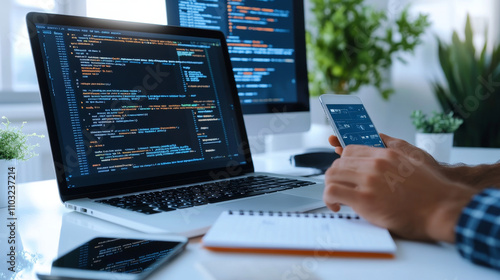 Hands of developer working on keyboard of laptop on white desk. top view. Workplace of programmer with notebook, table plant, smartphone, icons and interface elements.
