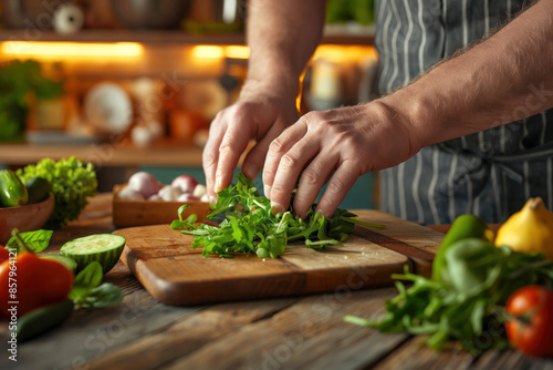 Hands of man chopping green vegetables on a wooden board in a warmly lit kitchen.