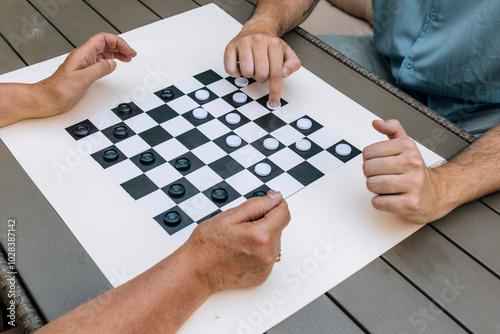 hand, man, playing, chess, table, 2, people, senior, adult, woman, day, checked, pattern, checker, board, game, parlour, piece, leisure, strategy, challenge, mid, pair, moving, caucasian, competition, male, female