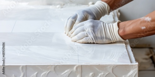 hands of the tiler are laying white ceramic tile on the wall. ai generated