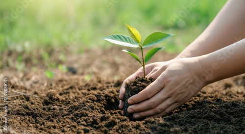 Hands planting young tree in soil, symbolizing reforestation and environmental conservation