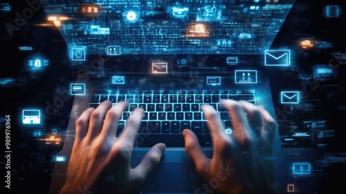 Hands typing on a computer surrounded by digital security symbols, representing cybersecurity.