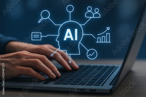 Hands typing on a laptop with a glowing ai brain network diagram