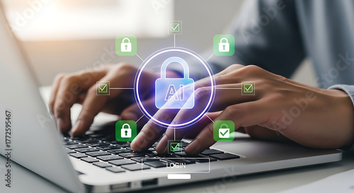 Hands typing on laptop with ai padlock icon and verification, representing artificial intelligence security system and data protection