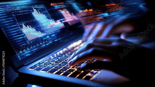 hand, laptop, datum, visualisation, technology, typing, keyboard, screen, digital, abstract, glow, graph, chart, statistic, modern, closeup, night time, information, analysis, workspace, computer, business, innovation, software, coding, financial, network, performance, research, productivity, futuristic, light, user, dashboard, communication, virtual