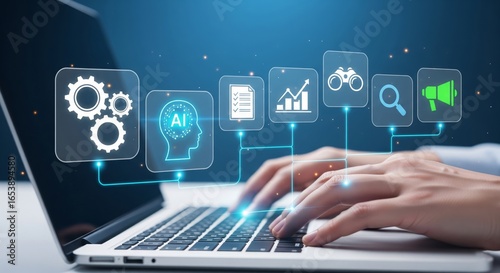 Hands Typing on Laptop with Large AI, Gear, Analytics, Marketing and Search Icons – Futuristic Technology Concept