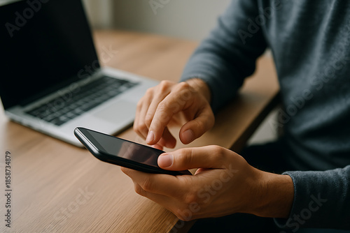 Hands Using Smartphone with Laptop on Wooden Desk