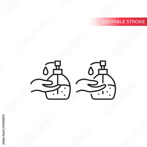 Hands washing.Soap bottle, hygienic sanitizer antibacterial gel with hand thin line vector icon. Editable stroke.