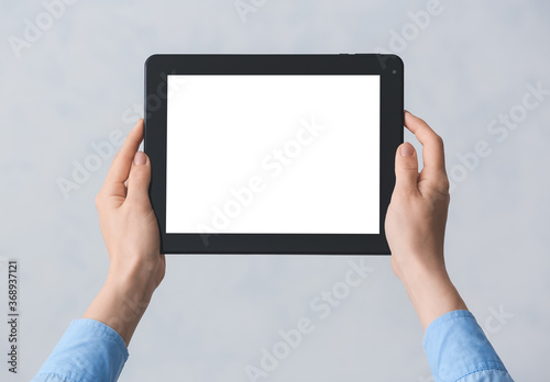 Hands with modern tablet computer on grey background