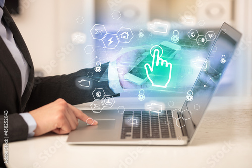 Hands working on laptop with digital icons