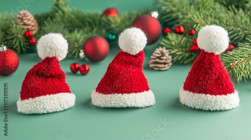 Hand-sewn mini Santa hats with pom-poms, isolated on a green background with holiday accents