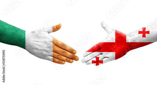Handshake between Georgia and Ireland flags painted on hands, isolated transparent image.