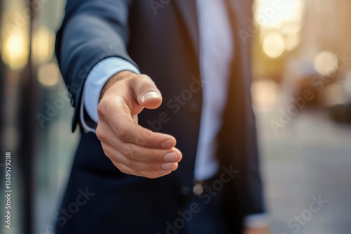 Handshake for Success: A person extends a hand, inviting a collaborative endeavor with a promise of a beneficial future, in the sphere of the professional landscape.