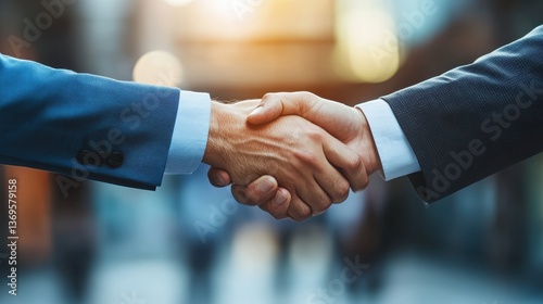 Handshake of Agreement: Two business professionals, their hands clasped in a firm handshake, symbolize partnership and collaboration in a successful venture.