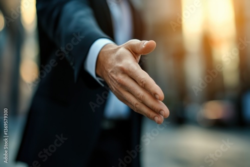 handshake, agreements, deal, business, professional, greeting, cooperation, gesture, invitation, partnership, meeting, welcome, support, collaboration, success, corporate, formal, elegant, trust, interaction, communication, networking, opportunity, negotiation, introduction, proposition, commitment, respect, approach, decision, confidence, hand, arm, suit, black, person, businessman, urban, closeup, blurred background, reaching, hand gesture