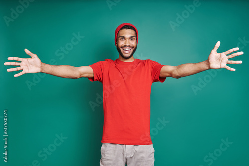 man, gesticulate, arms outstretched, friendship, greeting, embracing, happiness, smiling, african ethnicity, black, candid, confidence, lifestyle, cheerful, studio shot, green, colours, background, young adult, headwear, fashionable, trendy, style, modern, photogenic, male, people, casual clothes, one person