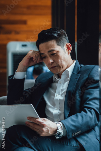 Handsome Asian man in elegant blue suit analyzing business report on his tablet while sitting in the cafe