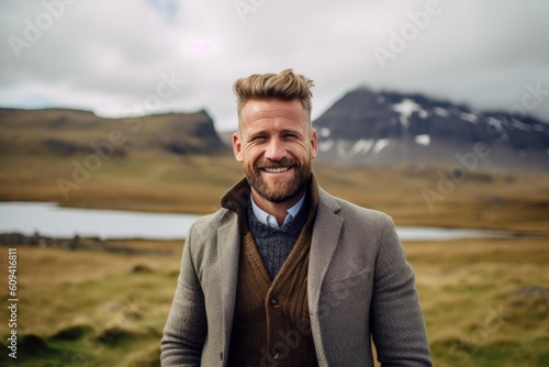 Handsome bearded man smiling and looking at camera while standing on the edge of a mountain in Iceland
