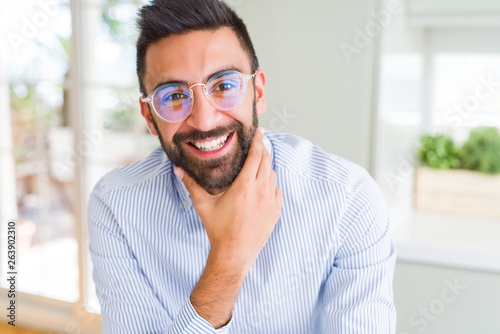 Handsome business man wearing glasses and smiling cheerful with confident smile on face
