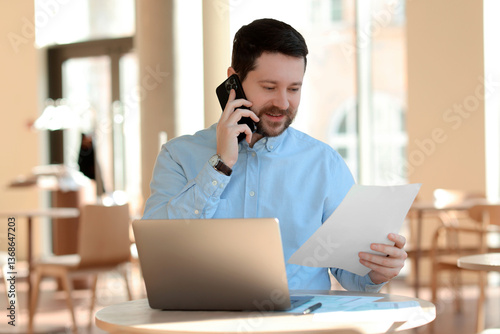Handsome business owner talking by smartphone at table with laptop in his cafe