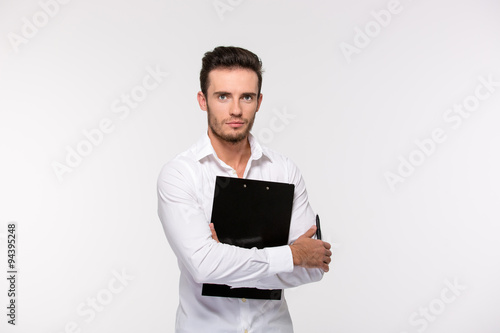 adult, attractive, background, boy, business, businessman, businessperson, caucasian, clothing, confident, equipment, expression, male, guy, photogenic, holding, isolated, man, manager, 1, pen, person, portrait, looking, camera, copy space, thinking, professional, satisfied, serious, shirt, shot, standing, studio, horizontal, white