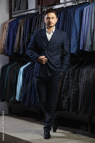 Handsome businessman in classic suit. A young stylish man in a jacket. It is in the showroom, trying on clothes, posing. Advertising photo