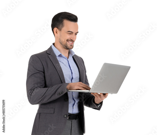 businessman, photogenic, laptop, suit, using, white, adult, background, business, career, caucasian, colours, communication, company, computer, corporate, device, employee, entrepreneur, formal, freelance, guy, happy, cyberspace, isolated, job, lifestyle, male, man, management, modern, occupation, office, online, people, person, portrait, profession, smiling, success, technology, work, men at work, young
