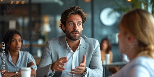 Handsome businessman standing explaining a project to his colleagues on coworking place,
