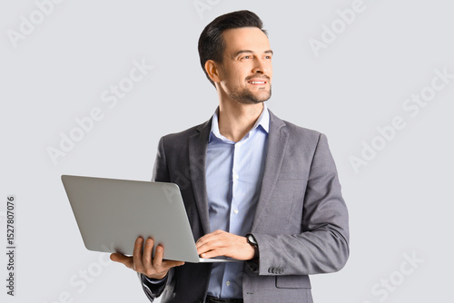 businessman, photogenic, laptop, light, using, adult, background, business, career, caucasian, colours, communication, company, computer, corporate, device, employee, entrepreneur, formal, freelance, grey, guy, happy, cyberspace, job, leadership, lifestyle, male, man, management, modern, occupation, office, online, people, person, portrait, profession, smiling, success, successful, suit, technology, work, men at work, young