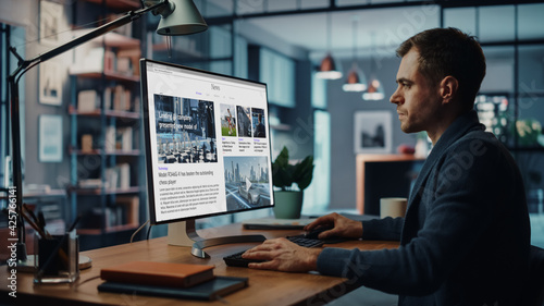 Handsome Caucasian Man in Cozy Creative Living Room Using Desktop Computer to Read Latest News. Freelance Male is Doing Financial Market Analysis and Report for Clients and Employer.