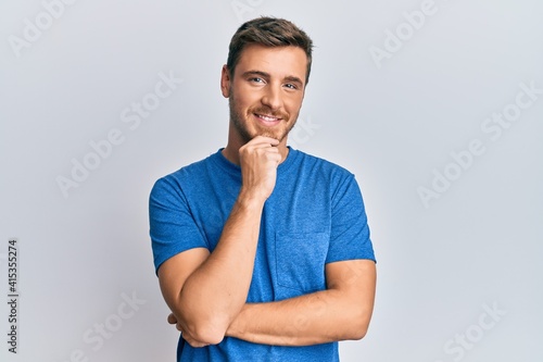 Handsome caucasian man wearing casual clothes smiling looking confident at the camera with crossed arms and hand on chin. thinking positive.