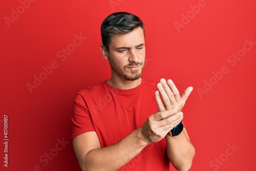 Handsome caucasian man wearing casual red tshirt suffering pain on hands and fingers, arthritis inflammation