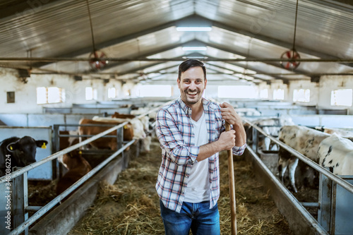 Handsome Caucasian smiling farmer in plaid shirt and jeans standing in stable and leaning on hay fork. All around are calves and cows.