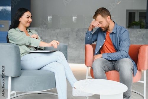 Handsome depressed man in casual clothes is leaning on his knees and telling about his problems while sitting on the couch at the psychotherapist.